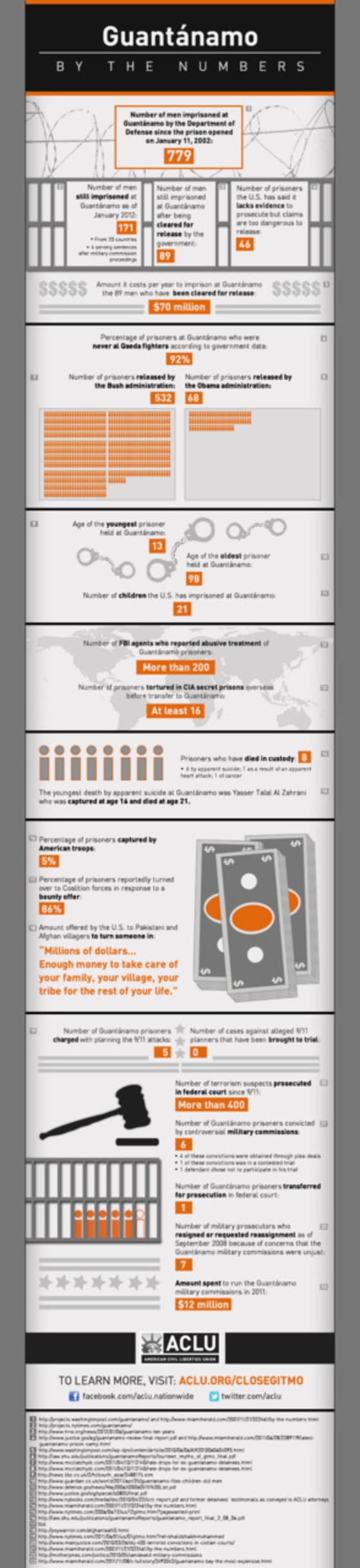 by Jane Susskind, published Jan 13, 2012Guantanamo, by the numbers Number of prisoners at #gitmo & cost of maintenance of the 10 year old prison. (source: ACLU)