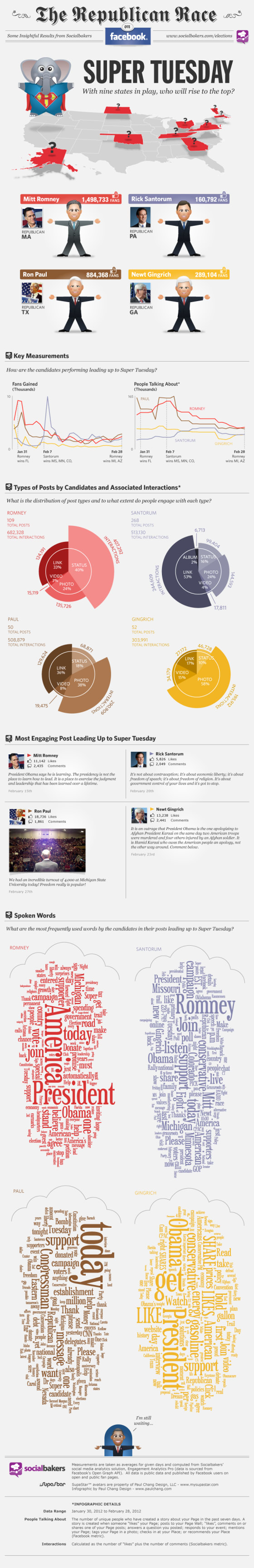 ALSO, going into Super Tuesday, the social media analytics company Socialbakers did a study analyzing the effectiveness of social marketing campaigns across all major social networks (including Facebook, Twitter, YouTube, LinkedIn and Google+). Here are the findings from their Super Tuesday study, revealing Facebook performance correlations in key campaign milestones: