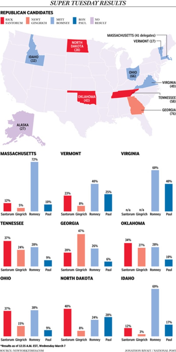 Mitt Romney (Republican): As speculated yesterday, "If Romney fails to sweep today’s contests, his campaign’s chance at a forced nomination is all but dead in the water." While he won the majority of states, the Super Tuesday results were anything but a sweep. His victory in Ohio was by the narrow margin of 0.8%, prompting questions about his inability to connect with middle-class voters and his failure to close up the primary race.