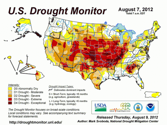One industry that is not seeing a timely response from the president is corn. Corn growers have seen some of the worse effects of the drought. They expect 13 percent less corn yield than in 2011, marking this year’s yield the lowest in nearly two decades. As one of the nation’s most in demand products for food and fuel, this puts a major strain on livestock producers who use corn as a primary feed source. They are now forced to contend over each bushel of corn with ethanol producers.
