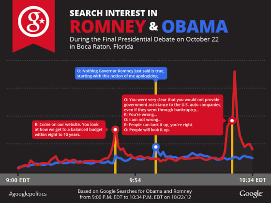 High-volume searches peaked several times during Monday’s debate between President Barack Obama and Governor Mitt Romney. The first spike in ‘Romney’ searches came when the Governor urged Obama to visit his campaign website to review his ‘balanced budget,’ that would be accomplished in eight to ten years. ‘Obama’ searches peaked when the President challenged Romney’s assertion that he had gone on an ‘apology tour’ when he came into office. Romney received the largest volume of searches when President Obama asserted,