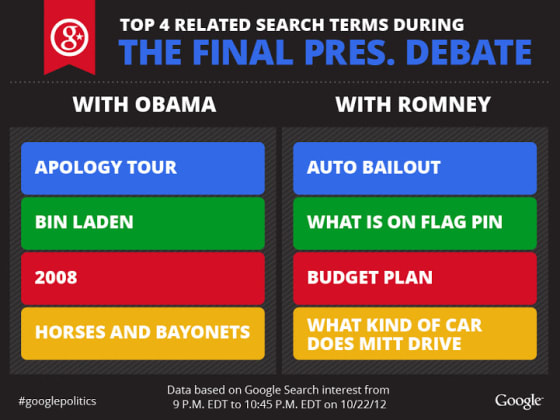 Aside from ‘Romney and Obama,’ the top four trending searches on Google during the debate were: horses and bayonets, Syria, Mali, and drones.