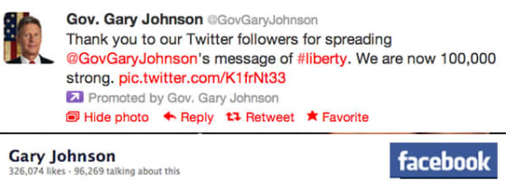 Gary Johnson is perhaps the most popular "online candidate" since Ron Paul, and undoubtably draws many of the Congressman's supporters. And with over 300,000 Facebook Likes, over 1,000,000 Google+ followers, and as of today, over 100,000 Twitter followers, Gary Johnson could be laying the groundwork to make a significant impact on the political conversation for a long-time to come.