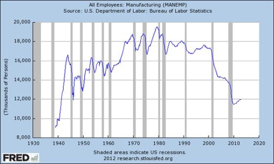 However, this isn't about what's good for one group of people versus another. The well being of America as a whole is the real question. Take a look at the chart below. Manufacturing employment is back to where it was in 1941 when America's population was vastly smaller. As a percentage of the workforce, the decline is much greater. Note the stunning fall in manufacturing employment starting in 2000.