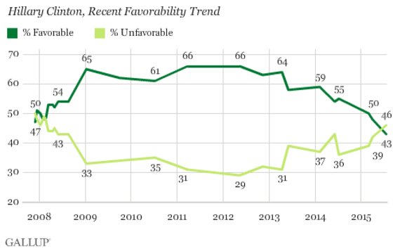 For the first time since the 2008 election, Clinton polls with an "unfavorable" (46-43) status nationwide among all voters. But this drop might not matter much when comparing Clinton to her opposition.
