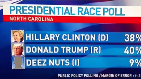 Among them is "Deez Nuts," who, according to the campaign's FEC form, lives in Iowa and is running as an independent. According to Public Policy Polling, Nuts is putting up decent numbers in North Carolina and Minnesota.