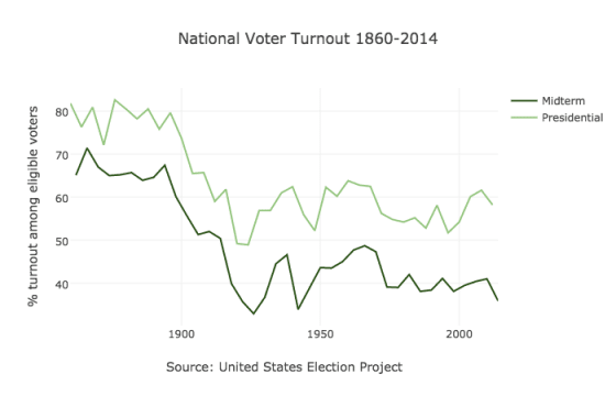 Considered together, declining voter turnout is most likely attributable to general voter apathy in election processes that are conducted for the partisan benefit of the Democrats and Republicans. At the same time voters are increasingly disillusioned, on a national scale, with the ability of those two parties to adequately represent them.