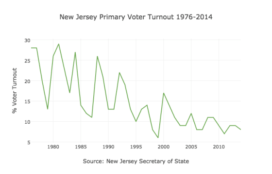The effect of top-two on voter turnout is minimal. However, voter turnout statistics among nonpartisans versus party-affiliated voters provide insight into the short-term effects of California’s nonpartisan top-two system. It is important to keep in mind that voter turnout in primary elections nationwide is plummeting especially in states with closed primaries. In New Jersey, for example, the turnout in 2014 was just 8 percent. In 2015, it was just over 5 percent. Nationwide, the average turnout in primary elections is just over 10 percent.