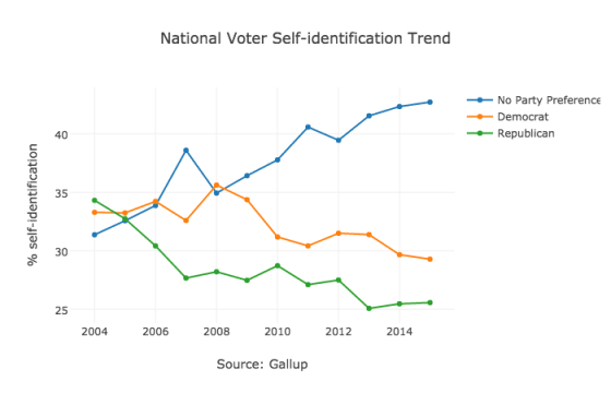 As in all presidential election cycles, the political parties are likely to see a major increase in party affiliation during the 2016 presidential election. That increase will not be due to more voters supporting the Republican or Democratic Party, but rather due to the fact that they have to join (or at least participate in a partisan election of) one of the two major political parties to vote for a favored candidate, whom they also think will be a viable candidate in the general election.