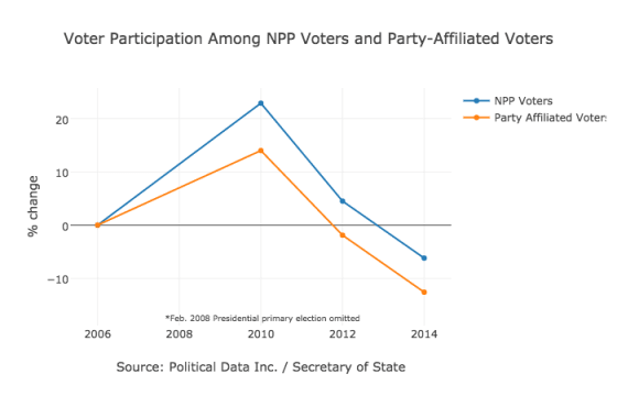 In the primary election of 2012, according to voter participation statistics by Political Data Inc., No Party Preference voters saw another increase in participation (4.6 percent), which outperformed Democratic voter participation (2.3 percent) and Republicans (-6.5 percent). Even though all political parties show a decline in primary participation in 2012 and 2014, nonpartisan turnout actually increased in 2012 and decreased far less than partisan voter turnout in 2014.
