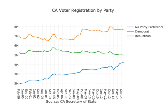The dramatic spike in California nonpartisan voter registration, since the last presidential election, suggests that voters are more likely to register and vote when they don’t have to join a political party to do so.