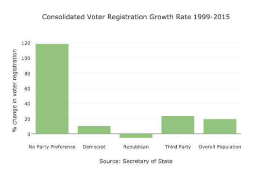 Since 1999, nonpartisan voters have seen the most significant increase in registrants compared to all other political parties in California. From 1999 to 2014, those registering as No Party Preference (NPP) skyrocketed compared to those registering as Democrats and Republicans. There was a 118 percent growth in NPP voters compared to a 10 percent increase in Democratic voters and a decrease of 5.3 percent in those registered as Republicans.