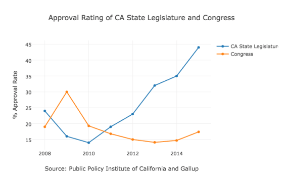 As of January 2015, Californians’ approval rating of government, among registered voters, stands at 44 percent. This is four times higher than congressional approval ratings. This percentage is up from a record-low average of 14 percent in 2010. The same data shows that individual approval ratings of their state legislators was at an all-time low of 27 percent in 2010; yet in 2015, this approval rating stands at 53 percent.