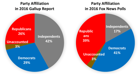 For example, thus far, the average 2016 Fox News poll has included around 17% independents. Yet, in early 2016, the widely respected Gallup Organization, which is not conducting this year’s polling, reported that 42% of Americans identify as independents. Given the widespread dissatisfaction with the two parties, the number of independents is unlikely to have decreased. It has probably increased. Thus, the Fox News polls are wildly unrepresentative.