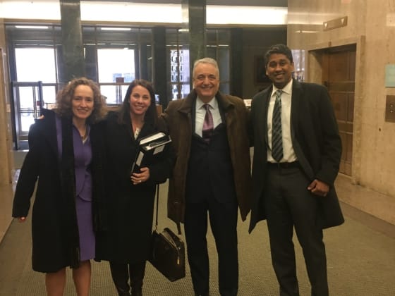 El equipo legal de Level the Playing Field, incluyendo la abogada principal Alexandra Shapiro (extrema izquierda), Cara McCormick, Directora Ejecutiva de LPF (centro), Peter Acherman, CEO de LPF (centro), y el abogado Chetan Patil (extrema derecha).