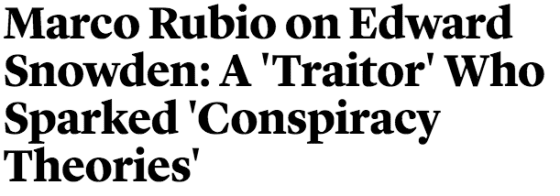 Source: The Atlantic, 4/25/14 Source: The Hill, 6/10/13 Source: BuzzFeed, 10/13/15 Source: The Atlantic, 11/22/13Not much has changed under the Trump administration. Trump has called Snowden a traitor and previously voiced his support for the NSA and its wide ability to gain intelligence under the Patriot Act, a law passed with overwhelming bipartisan support in the wake of September 11, 2001.