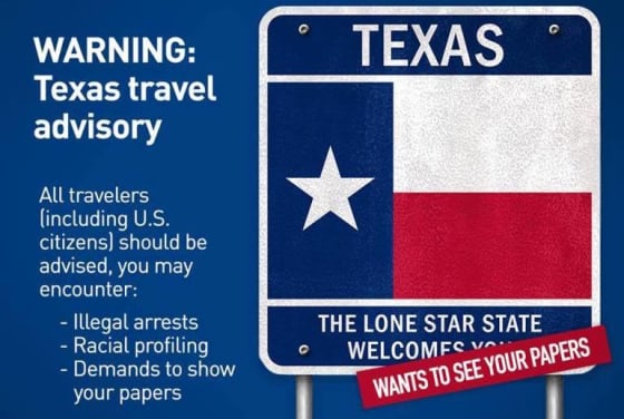 In an extraordinary move, the ACLU, a non-profit, has issued a “travel warning” for the state of Texas. The image, created by the ACLU, warns that authorities could engage in among other things, “illegal arrests” and “racial profiling.”