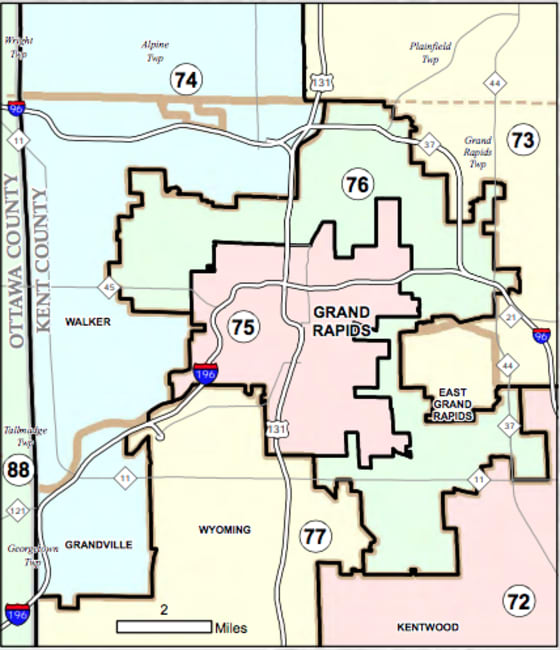 How long does it take to travel through a legislative district in Michigan? Well, if you are in Grand Rapids, you can jog through three on a single street: