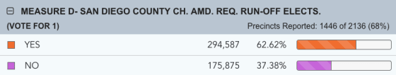 Measure D amends the county charter to force races for all San Diego County offices to a runoff in the general election, regardless of the outcome in the primary. Under current law, candidates who receive more than 50 percent of the vote in a primary election are declared the winner.