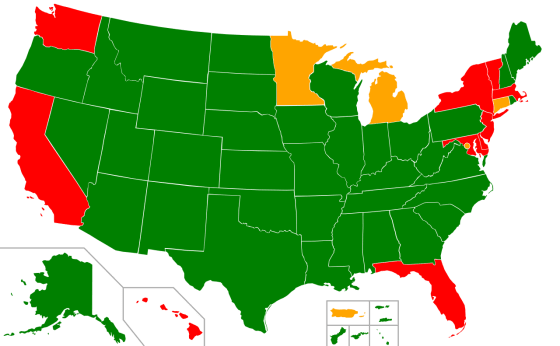 Green: Bump stocks legal || Yellow: Legality unclear || Red: Bump stocks illegal