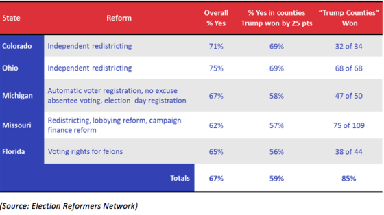 And yet, just last year, many of the reforms featured in HR1 won backing from Republican majorities in several states. Reforms like independent redistricting, automatic voter registration, campaign finance reform, and felon enfranchisement won handily in state ballot initiatives, with bipartisan support. In “Trump Counties” (those the President won by 25 percentage points or more) across five purple states, reform won by an aggregate 59%. (See chart.)